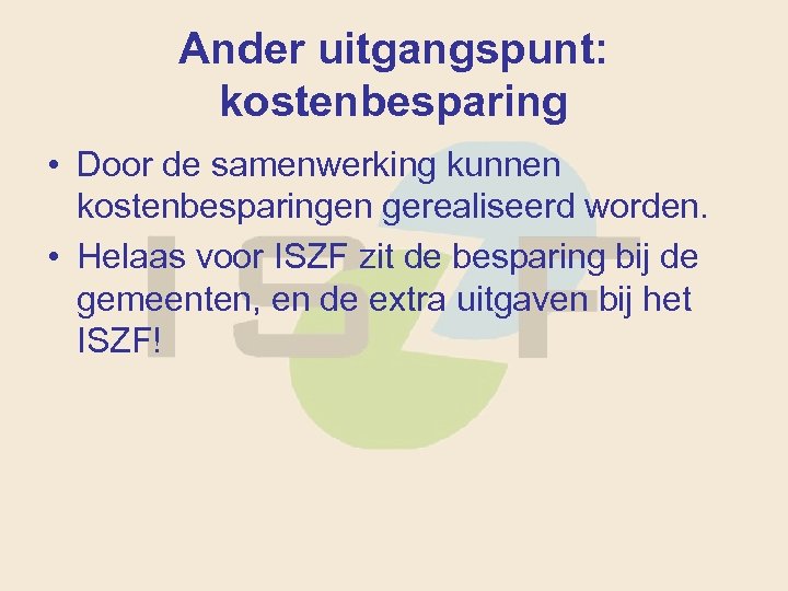 Ander uitgangspunt: kostenbesparing • Door de samenwerking kunnen kostenbesparingen gerealiseerd worden. • Helaas voor ISZF zit de besparing bij de gemeenten, en de extra uitgaven bij het ISZF!