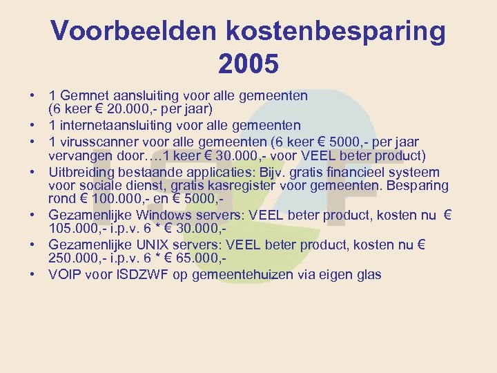 Voorbeelden kostenbesparing 2005 • 1 Gemnet aansluiting voor alle gemeenten (6 keer € 20. 000, - per jaar) • 1 internetaansluiting voor alle gemeenten • 1 virusscanner voor alle gemeenten (6 keer € 5000, - per jaar vervangen door…. 1 keer € 30. 000, - voor VEEL beter product) • Uitbreiding bestaande applicaties: Bijv. gratis financieel systeem voor sociale dienst, gratis kasregister voor gemeenten. Besparing rond € 100. 000, - en € 5000, • Gezamenlijke Windows servers: VEEL beter product, kosten nu € 105. 000, - i. p. v. 6 * € 30. 000, • Gezamenlijke UNIX servers: VEEL beter product, kosten nu € 250. 000, - i. p. v. 6 * € 65. 000, • VOIP voor ISDZWF op gemeentehuizen via eigen glas