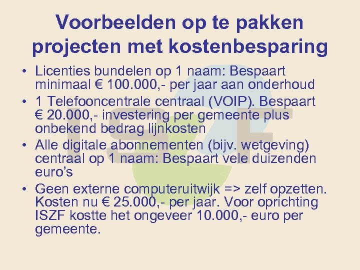 Voorbeelden op te pakken projecten met kostenbesparing • Licenties bundelen op 1 naam: Bespaart minimaal € 100. 000, - per jaar aan onderhoud • 1 Telefooncentrale centraal (VOIP). Bespaart € 20. 000, - investering per gemeente plus onbekend bedrag lijnkosten • Alle digitale abonnementen (bijv. wetgeving) centraal op 1 naam: Bespaart vele duizenden euro’s • Geen externe computeruitwijk => zelf opzetten. Kosten nu € 25. 000, - per jaar. Voor oprichting ISZF kostte het ongeveer 10. 000, - euro per gemeente.