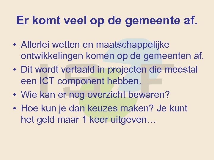 Er komt veel op de gemeente af. • Allerlei wetten en maatschappelijke ontwikkelingen komen op de gemeenten af. • Dit wordt vertaald in projecten die meestal een ICT component hebben. • Wie kan er nog overzicht bewaren? • Hoe kun je dan keuzes maken? Je kunt het geld maar 1 keer uitgeven…
