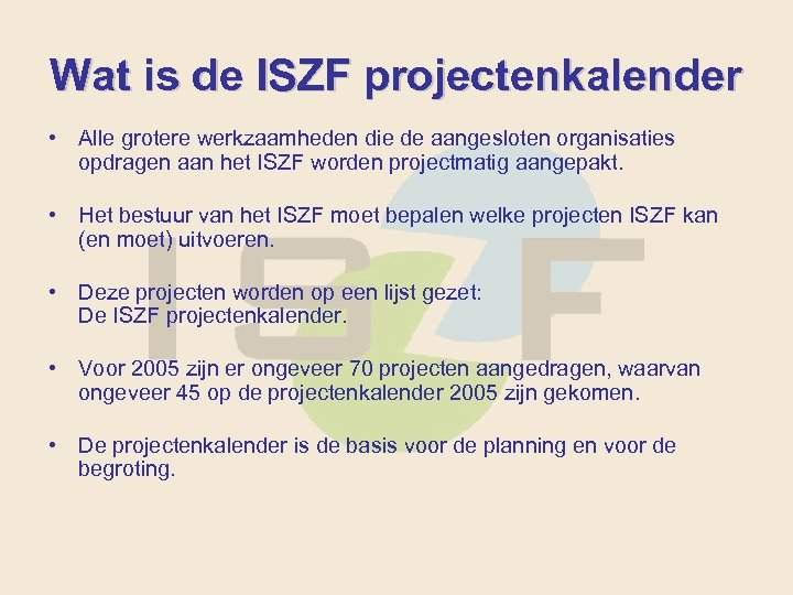 Wat is de ISZF projectenkalender • Alle grotere werkzaamheden die de aangesloten organisaties opdragen aan het ISZF worden projectmatig aangepakt. • Het bestuur van het ISZF moet bepalen welke projecten ISZF kan (en moet) uitvoeren. • Deze projecten worden op een lijst gezet: De ISZF projectenkalender. • Voor 2005 zijn er ongeveer 70 projecten aangedragen, waarvan ongeveer 45 op de projectenkalender 2005 zijn gekomen. • De projectenkalender is de basis voor de planning en voor de begroting.