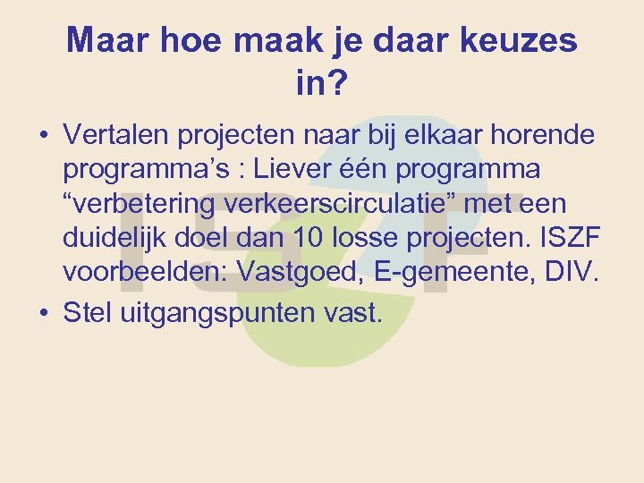Maar hoe maak je daar keuzes in? • Vertalen projecten naar bij elkaar horende programma’s : Liever één programma “verbetering verkeerscirculatie” met een duidelijk doel dan 10 losse projecten. ISZF voorbeelden: Vastgoed, E-gemeente, DIV. • Stel uitgangspunten vast.