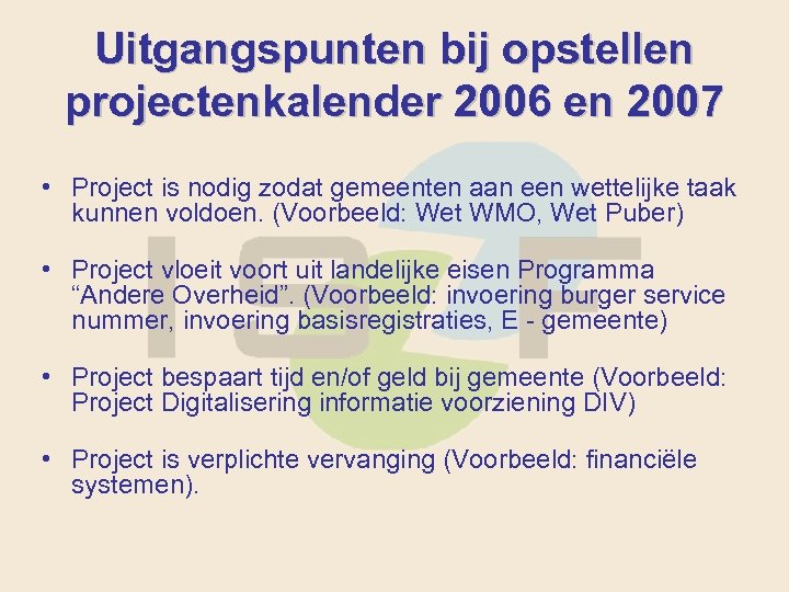 Uitgangspunten bij opstellen projectenkalender 2006 en 2007 • Project is nodig zodat gemeenten aan een wettelijke taak kunnen voldoen. (Voorbeeld: Wet WMO, Wet Puber) • Project vloeit voort uit landelijke eisen Programma “Andere Overheid”. (Voorbeeld: invoering burger service nummer, invoering basisregistraties, E - gemeente) • Project bespaart tijd en/of geld bij gemeente (Voorbeeld: Project Digitalisering informatie voorziening DIV) • Project is verplichte vervanging (Voorbeeld: financiële systemen).