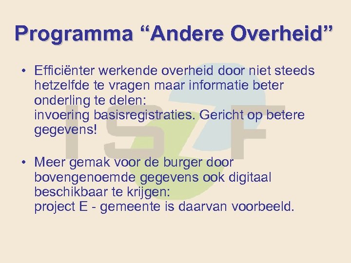Programma “Andere Overheid” • Efficiënter werkende overheid door niet steeds hetzelfde te vragen maar informatie beter onderling te delen: invoering basisregistraties. Gericht op betere gegevens! • Meer gemak voor de burger door bovengenoemde gegevens ook digitaal beschikbaar te krijgen: project E - gemeente is daarvan voorbeeld.