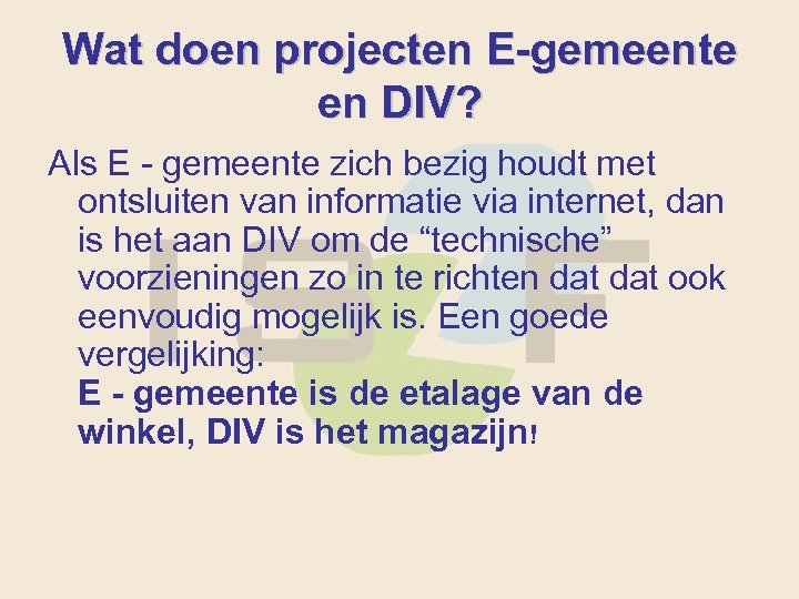 Wat doen projecten E-gemeente en DIV? Als E - gemeente zich bezig houdt met ontsluiten van informatie via internet, dan is het aan DIV om de “technische” voorzieningen zo in te richten dat ook eenvoudig mogelijk is. Een goede vergelijking: E - gemeente is de etalage van de winkel, DIV is het magazijn!