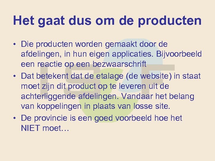 Het gaat dus om de producten • Die producten worden gemaakt door de afdelingen, in hun eigen applicaties. Bijvoorbeeld een reactie op een bezwaarschrift • Dat betekent dat de etalage (de website) in staat moet zijn dit product op te leveren uit de achterliggende afdelingen. Vandaar het belang van koppelingen in plaats van losse site. • De provincie is een goed voorbeeld hoe het NIET moet…