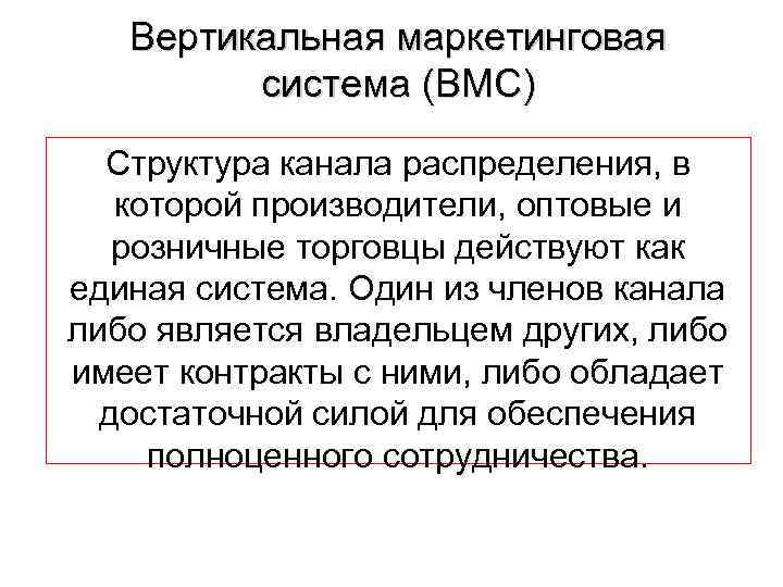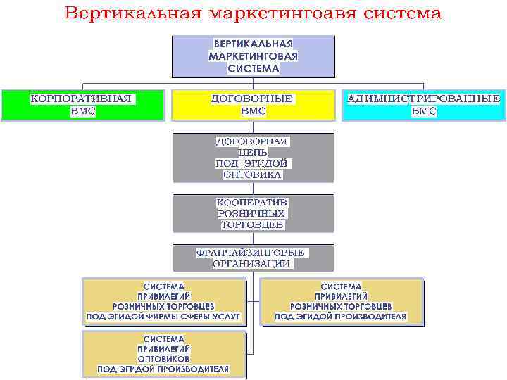 Вертикальная маркетинговая система (ВМС) Структура канала распределения, в которой производители, оптовые и розничные торговцы действуют как единая система. Один из членов канала либо является владельцем других, либо имеет контракты с ними, либо обладает достаточной силой для обеспечения полноценного сотрудничества.