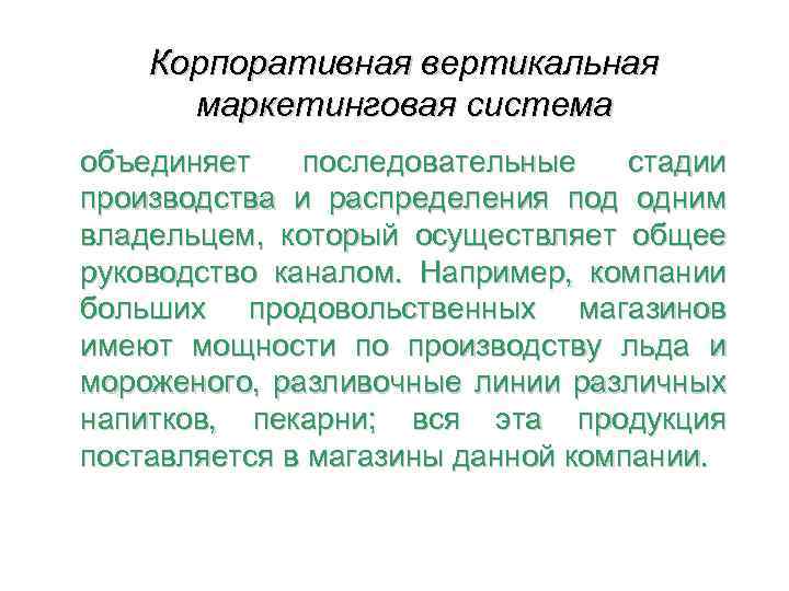 Корпоративная вертикальная маркетинговая система объединяет последовательные стадии производства и распределения под одним владельцем, который осуществляет общее руководство каналом. Например, компании больших продовольственных магазинов имеют мощности по производству льда и мороженого, разливочные линии различных напитков, пекарни; вся эта продукция поставляется в магазины данной компании.