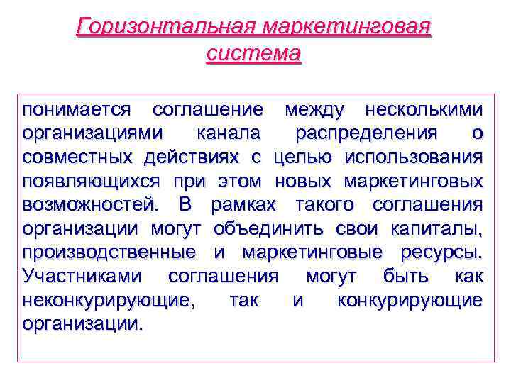 Горизонтальная маркетинговая система понимается соглашение между несколькими организациями канала распределения о совместных действиях с целью использования появляющихся при этом новых маркетинговых возможностей. В рамках такого соглашения организации могут объединить свои капиталы, производственные и маркетинговые ресурсы. Участниками соглашения могут быть как неконкурирующие, так и конкурирующие организации.