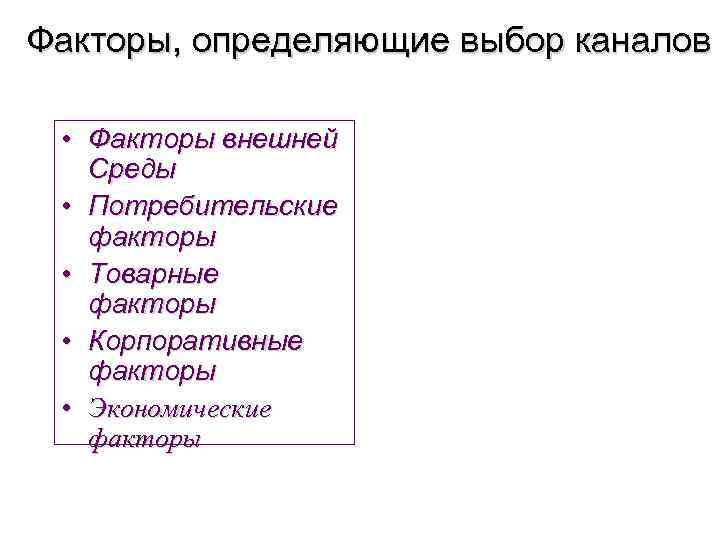 Факторы, определяющие выбор каналов • Факторы внешней Среды • Потребительские факторы • Товарные факторы • Корпоративные факторы • Экономические факторы