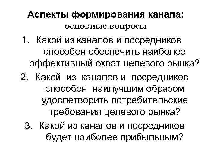 Аспекты формирования канала: основные вопросы 1. Какой из каналов и посредников способен обеспечить наиболее эффективный охват целевого рынка? 2. Какой из каналов и посредников способен наилучшим образом удовлетворить потребительские требования целевого рынка? 3. Какой из каналов и посредников будет наиболее прибыльным?