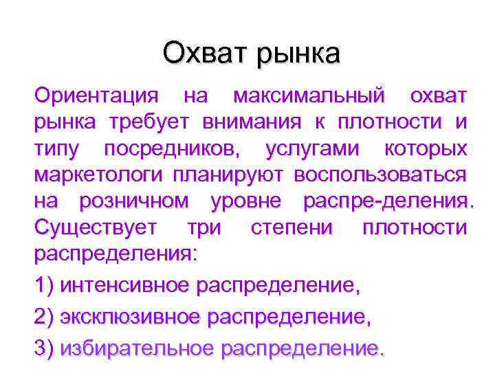 Охват рынка Ориентация на максимальный охват рынка требует внимания к плотности и типу посредников, услугами которых маркетологи планируют воспользоваться на розничном уровне распре деления. Существует три степени плотности распределения: 1) интенсивное распределение, 2) эксклюзивное распределение, 3) избирательное распределение.