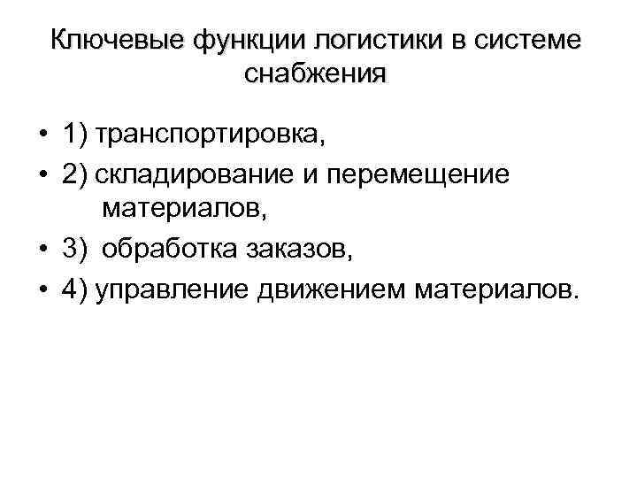 Ключевые функции логистики в системе снабжения • 1) транспортировка, • 2) складирование и перемещение материалов, • 3) обработка заказов, • 4) управление движением материалов.