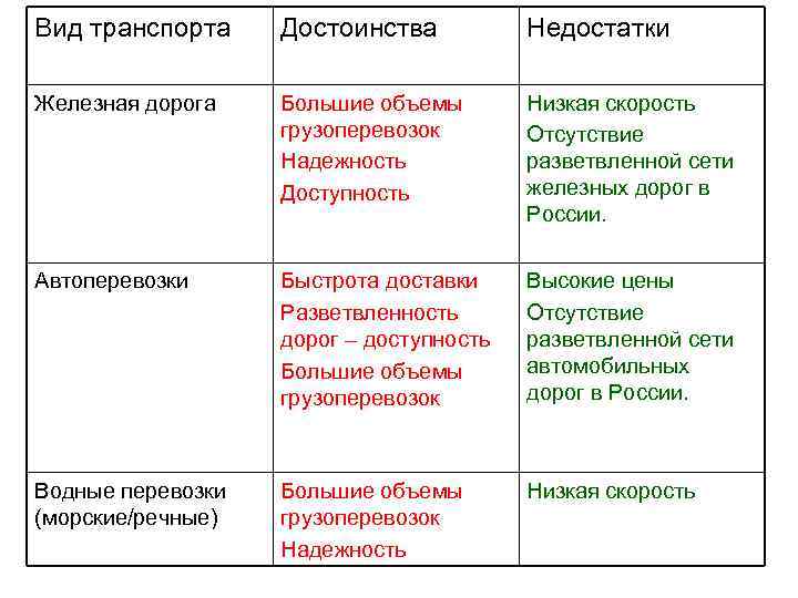 Вид транспорта Достоинства Недостатки Железная дорога Большие объемы грузоперевозок Надежность Доступность Низкая скорость Отсутствие разветвленной сети железных дорог в России. Автоперевозки Быстрота доставки Разветвленность дорог – доступность Большие объемы грузоперевозок Высокие цены Отсутствие разветвленной сети автомобильных дорог в России. Водные перевозки (морские/речные) Большие объемы грузоперевозок Надежность Низкая скорость