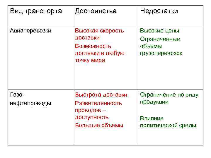 Вид транспорта Достоинства Недостатки Авиаперевозки Высокая скорость доставки Возможность доставки в любую точку мира Высокие цены Ограниченные объемы грузоперевозок Газо нефтепроводы Быстрота доставки Разветвленность проводов – доступность Большие объемы Ограничение по виду продукции Влияние политической среды
