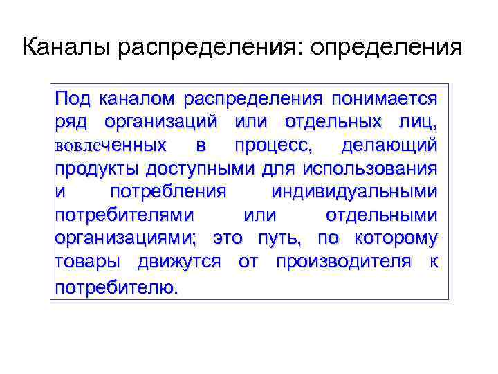 Каналы распределения: определения Под каналом распределения понимается ряд организаций или отдельных лиц, вовлеченных в процесс, делающий продукты доступными для использования и потребления индивидуальными потребителями или отдельными организациями; это путь, по которому товары движутся от производителя к потребителю.
