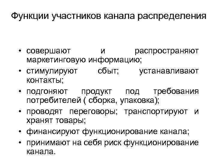Функции участников канала распределения • совершают и распространяют маркетинговую информацию; • стимулируют сбыт; устанавливают контакты; • подгоняют продукт под требования потребителей ( сборка, упаковка); • проводят переговоры; транспортируют и хранят товары; • финансируют функционирование канала; • принимают на себя риск функционирование канала.