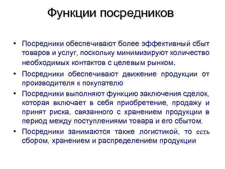 Функции посредников • Посредники обеспечивают более эффективный сбыт товаров и услуг, поскольку минимизируют количество необходимых контактов с целевым рынком. • Посредники обеспечивают движение продукции от производителя к покупателю • Посредники выполняют функцию заключения сделок, которая включает в себя приобретение, продажу и принят риска, связанного с хранением продукции в период между поступлениями товара и его сбытом. • Посредники занимаются также логистикой, то есть сбором, хранением и распределением продукции