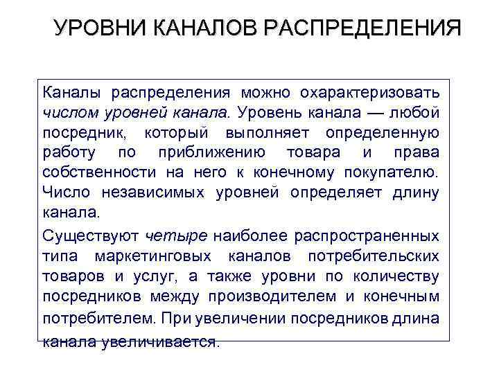УРОВНИ КАНАЛОВ РАСПРЕДЕЛЕНИЯ Каналы распределения можно охарактеризовать числом уровней канала. Уровень канала — любой посредник, который выполняет определенную работу по приближению товара и права собственности на него к конечному покупателю. Число независимых уровней определяет длину канала. Существуют четыре наиболее распространенных типа маркетинговых каналов потребительских товаров и услуг, а также уровни по количеству посредников между производителем и конечным потребителем. При увеличении посредников длина канала увеличивается.