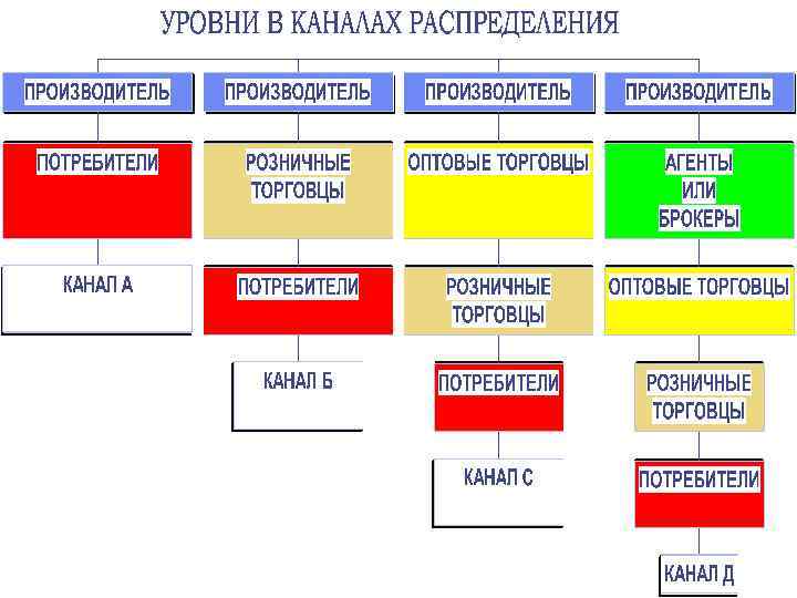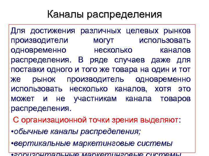 Каналы распределения Для достижения различных целевых рынков производители могут использовать одновременно несколько каналов распределения. В ряде случаев даже для поставки одного и того же товара на один и тот же рынок производитель одновременно использовать несколько каналов, хотя это может и не участникам канала товаров распределения. С организационной точки зрения выделяют: • обычные каналы распределения; • вертикальные маркетинговые системы