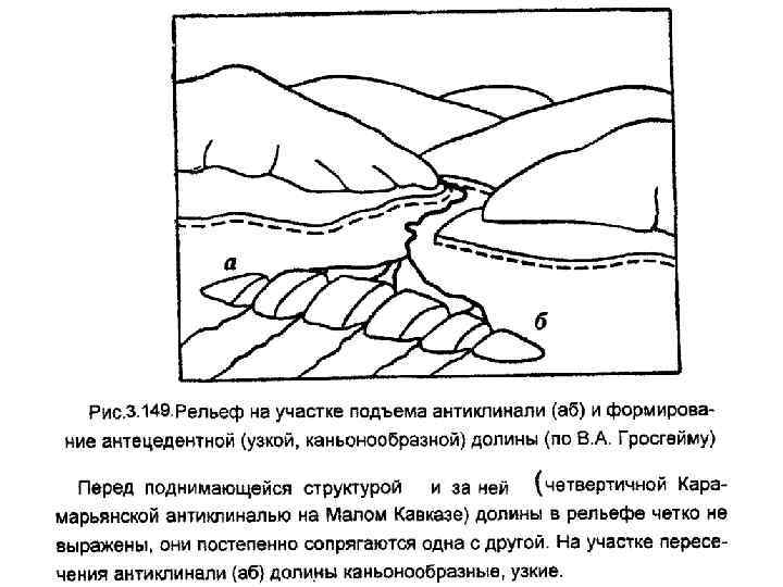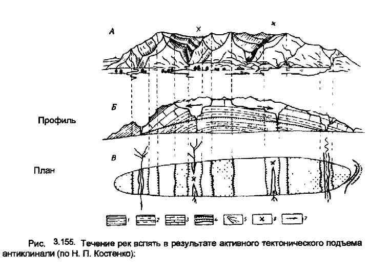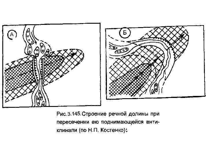 Река пересекает поднимающуюся антиклиналь. Подъем структуры приводит к смещению реки, река обтекает структуру. Бывшая долина (пунктир) оказывается приближенной к осевой зоне структуры.