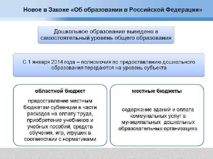 Новое в Законе «Об образовании в РФ» в полном объёме финансируется содержание С(К)ОУ отдельные организации, осуществляющие образовательную деятельность по адаптивным основным образовательным программам, создаются субъектами РФ