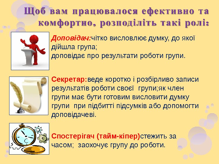 Доповідач: чітко висловлює думку, до якої дійшла група; доповідає про результати роботи групи. Секретар: веде коротко і розбірливо записи результатів роботи своєї групи; як член групи має бути готовим висловити думку групи при підбитті підсумків або допомогти доповідачеві. Спостерігач (тайм-кіпер) стежить за часом; заохочує групу до роботи.