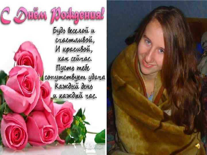 У цей щасливий день народилася ти! І з цього моменту почала цвісти, Цвітом тим своїм радуєш всіх, І вітання щирі ти прийми від усіх! Бажаєм щастя, успіху, любові, Щоб не було лихої долі, Щоб весело в світі жилося, Щоб що хотілось те й моглося!
