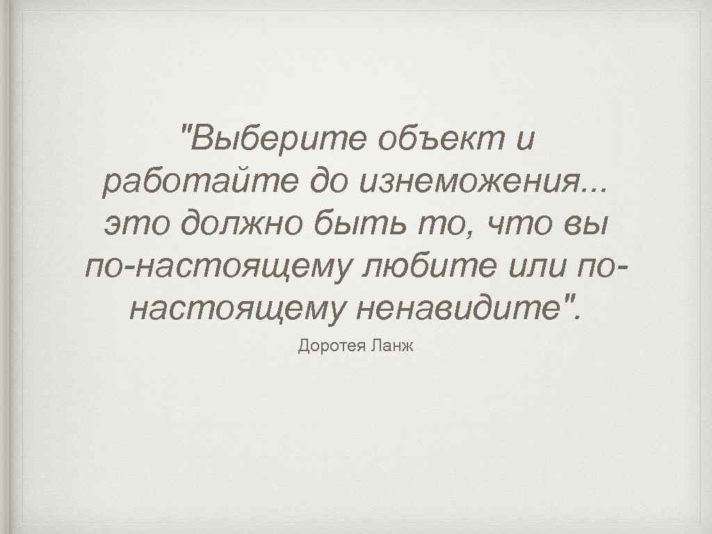 "Выберите объект и работайте до изнеможения. . . это должно быть то, что вы по-настоящему любите или понастоящему ненавидите". Доротея Ланж
