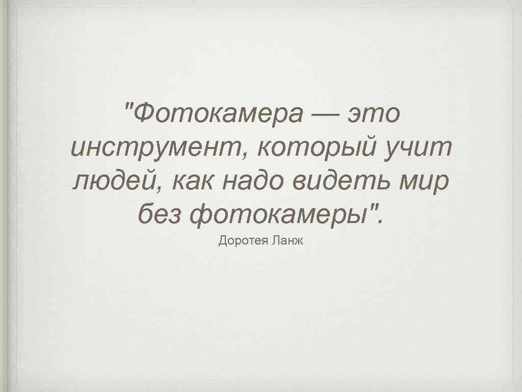 "Фотокамера — это инструмент, который учит людей, как надо видеть мир без фотокамеры". Доротея Ланж