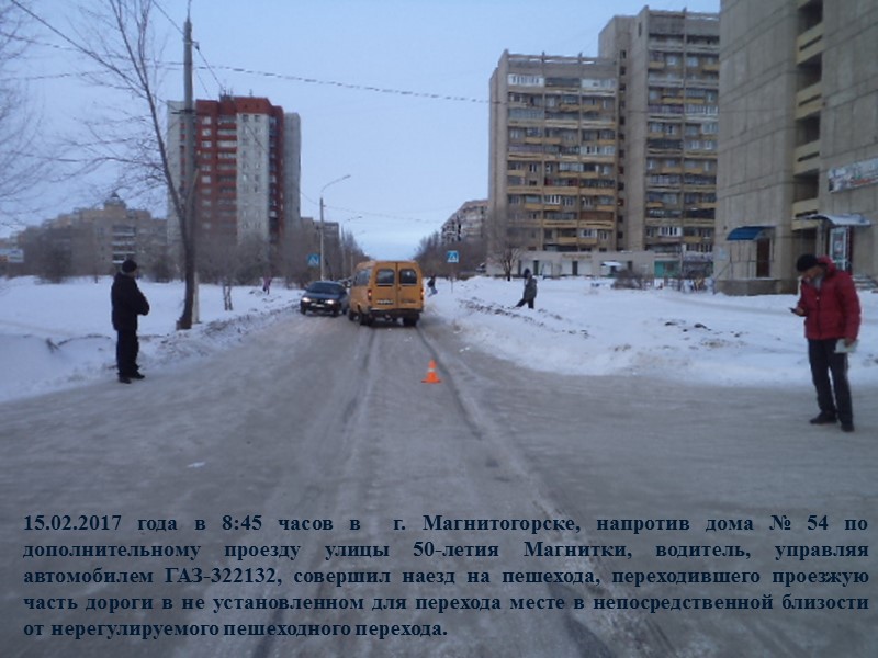 15.02.2017 года в 8:45 часов в г. Магнитогорске, напротив дома № 54 по дополнительному проезду улицы 50-летия Магнитки, водитель, управляя автомобилем ГАЗ-322132, совершил наезд на пешехода, переходившего проезжую часть дороги в не установленном для перехода месте в непосредственной близости от нерегулируемого пешеходного перехода.