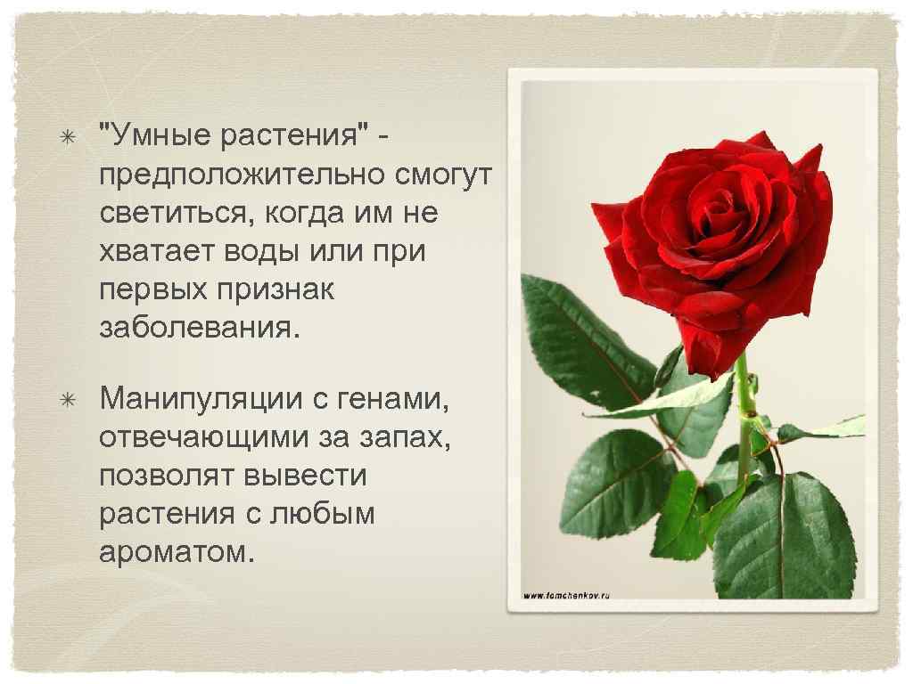 "Умные растения" предположительно смогут светиться, когда им не хватает воды или при первых признак заболевания. Манипуляции с генами, отвечающими за запах, позволят вывести растения с любым ароматом.