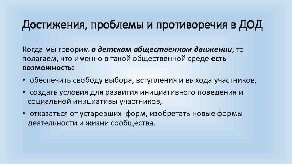 Достижения, проблемы и противоречия в ДОД Когда мы говорим о детском общественном движении, то полагаем, что именно в такой общественной среде есть возможность: • обеспечить свободу выбора, вступления и выхода участников, • создать условия для развития инициативного поведения и социальной инициативы участников, • отказаться от устаревших форм, изобретать новые формы деятельности и жизни сообщества.