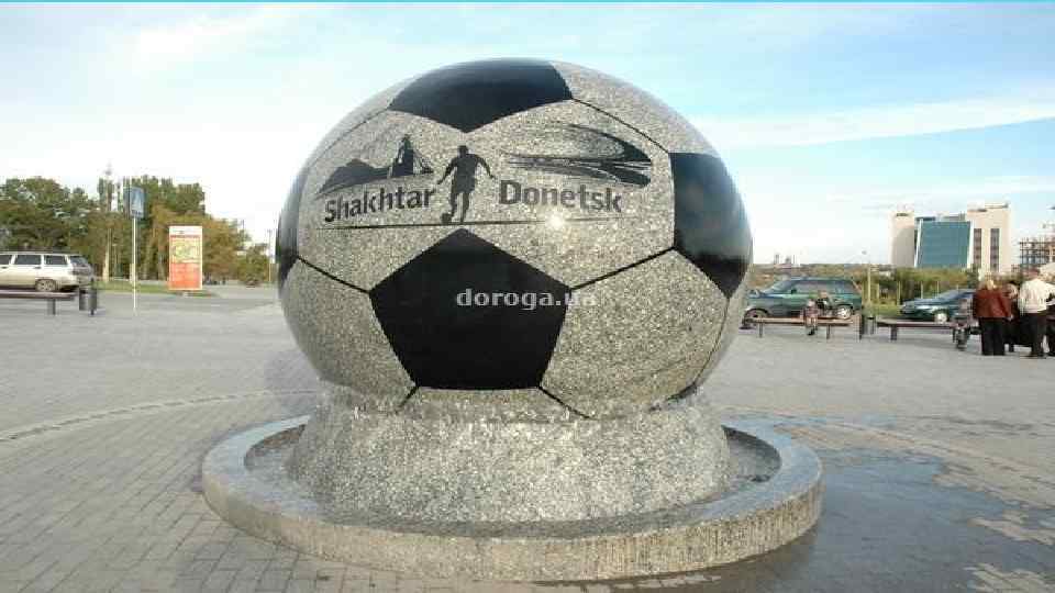 На площади перед "Донбасс. Ареной" установлен мяч-фонтан. 28 -тонный шар диаметром 2, 7 м крутится под давлением двух струй воды. Считается самым большим вращающимся гранитным шаром в мире.
