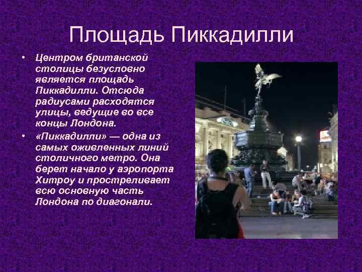 Площадь Пиккадилли • Центром британской столицы безусловно является площадь Пиккадилли. Отсюда радиусами расходятся улицы, ведущие во все концы Лондона. • «Пиккадилли» — одна из самых оживленных линий столичного метро. Она берет начало у аэропорта Хитроу и простреливает всю основную часть Лондона по диагонали.