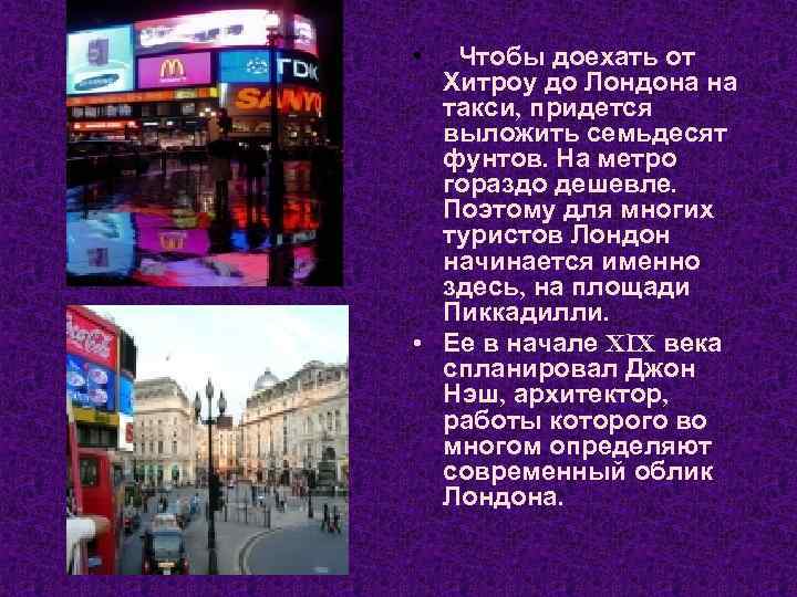 • . Чтобы доехать от Хитроу до Лондона на такси, придется выложить семьдесят фунтов. На метро гораздо дешевле. Поэтому для многих туристов Лондон начинается именно здесь, на площади Пиккадилли. • Ее в начале XIX века спланировал Джон Нэш, архитектор, работы которого во многом определяют современный облик Лондона.