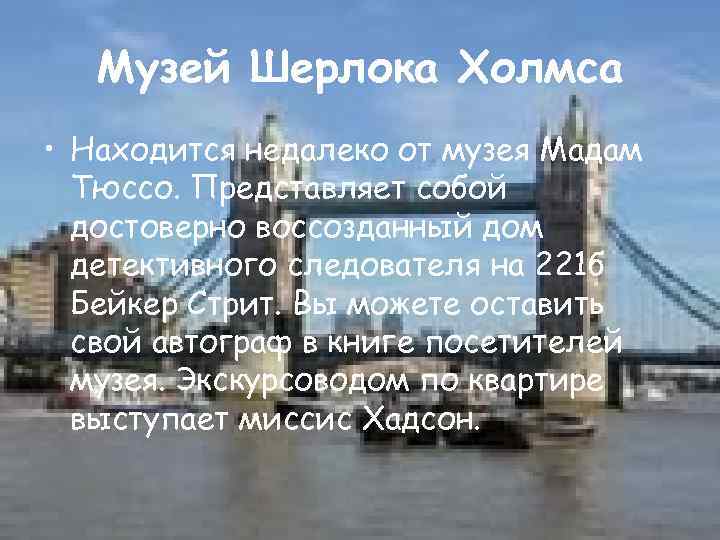 Музей Шерлока Холмса • Находится недалеко от музея Мадам Тюссо. Представляет собой достоверно воссозданный дом детективного следователя на 221 б Бейкер Стрит. Вы можете оставить свой автограф в книге посетителей музея. Экскурсоводом по квартире выступает миссис Хадсон.
