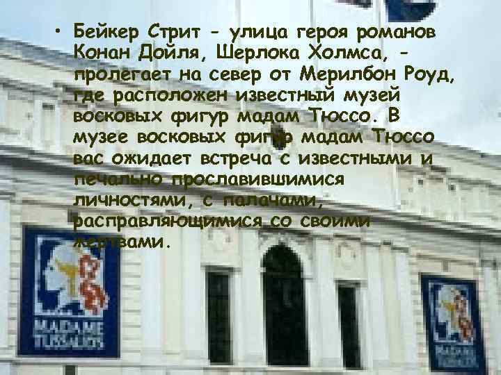 • Бейкер Стрит - улица героя романов Конан Дойля, Шерлока Холмса, - пролегает на север от Мерилбон Роуд, где расположен известный музей восковых фигур мадам Тюссо. В музее восковых фигур мадам Тюссо вас ожидает встреча с известными и печально прославившимися личностями, с палачами, расправляющимися со своими жертвами.