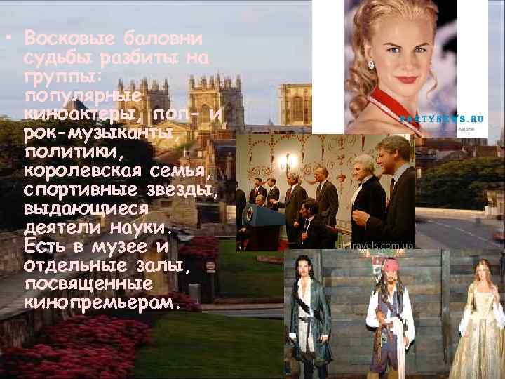 • Восковые баловни судьбы разбиты на группы: популярные киноактеры, поп- и рок-музыканты, политики, королевская семья, спортивные звезды, выдающиеся деятели науки. Есть в музее и отдельные залы, посвященные кинопремьерам.