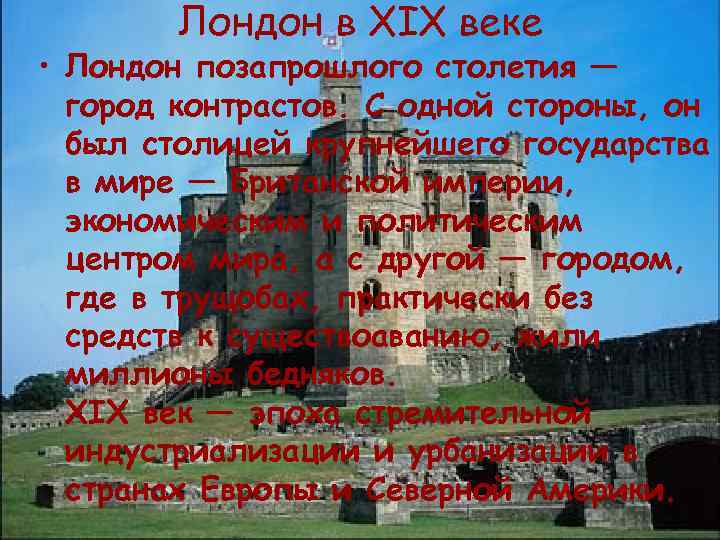 Лондон в XIX веке • Лондон позапрошлого столетия — город контрастов. С одной стороны, он был столицей крупнейшего государства в мире — Британской империи, экономическим и политическим центром мира, а с другой — городом, где в трущобах, практически без средств к существоаванию, жили миллионы бедняков. XIX век — эпоха стремительной индустриализации и урбанизации в странах Европы и Северной Америки.