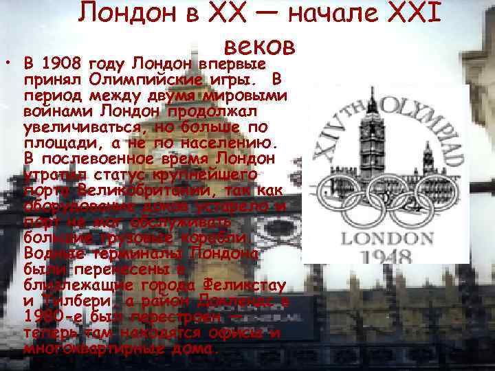 Лондон в XX — начале XXI веков • В 1908 году Лондон впервые принял Олимпийские игры. В период между двумя мировыми войнами Лондон продолжал увеличиваться, но больше по площади, а не по населению. В послевоенное время Лондон утратил статус крупнейшего порта Великобритании, так как оборудование доков устарело и порт не мог обслуживать большие грузовые корабли. Водные терминалы Лондона были перенесены в близлежащие города Феликстау и Тилбери, а район Доклендс в 1980 -е был перестроен — теперь там находятся офисы и многоквартирные дома.