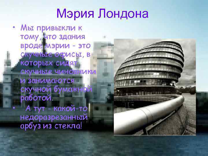 Мэрия Лондона • Мы привыкли к тому, что здания вроде мэрии - это скучные офисы, в которых сидят скучные чиновники и занимаются скучной бумажной работой. • А тут - какой-то недоразрезанный арбуз из стекла!