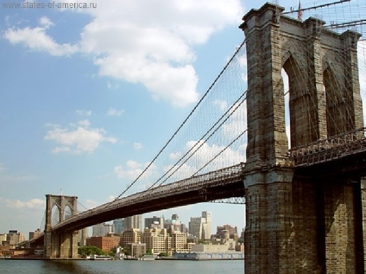 Бруклинский мост. Ø Бруклинским мостом ( «Brooklyn Bridge» ), соединяются районы Нью. Йорка Бруклин и. Манхеттен. Он «переброшен» через пролив Ист-Ривер. Этот мост – один из старейших мостов подвесного типа в Америке. Длиною Бруклинский мост 1825 м. , и на конец строительства, он являлся длиннейшим подвесным в мире, также он – первый мост с использованием стали.