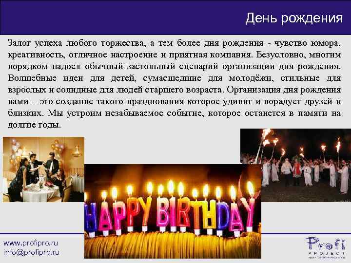 День рождения Залог успеха любого торжества, а тем более дня рождения - чувство юмора, креативность, отличное настроение и приятная компания. Безусловно, многим порядком надоел обычный застольный сценарий организации дня рождения. Волшебные идеи для детей, сумасшедшие для молодёжи, стильные для взрослых и солидные для людей старшего возраста. Организация дня рождения нами – это создание такого празднования которое удивит и порадует друзей и близких. Мы устроим незабываемое событие, которое останется в памяти на долгие годы. www. profipro. ru info@profipro. ru