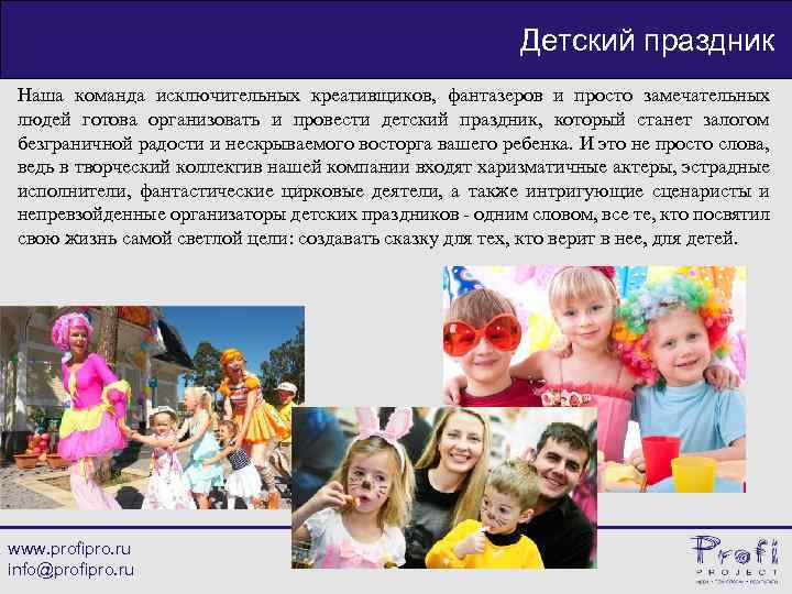 Детский праздник Наша команда исключительных креативщиков, фантазеров и просто замечательных людей готова организовать и провести детский праздник, который станет залогом безграничной радости и нескрываемого восторга вашего ребенка. И это не просто слова, ведь в творческий коллектив нашей компании входят харизматичные актеры, эстрадные исполнители, фантастические цирковые деятели, а также интригующие сценаристы и непревзойденные организаторы детских праздников - одним словом, все те, кто посвятил свою жизнь самой светлой цели: создавать сказку для тех, кто верит в нее, для детей. www. profipro. ru info@profipro. ru