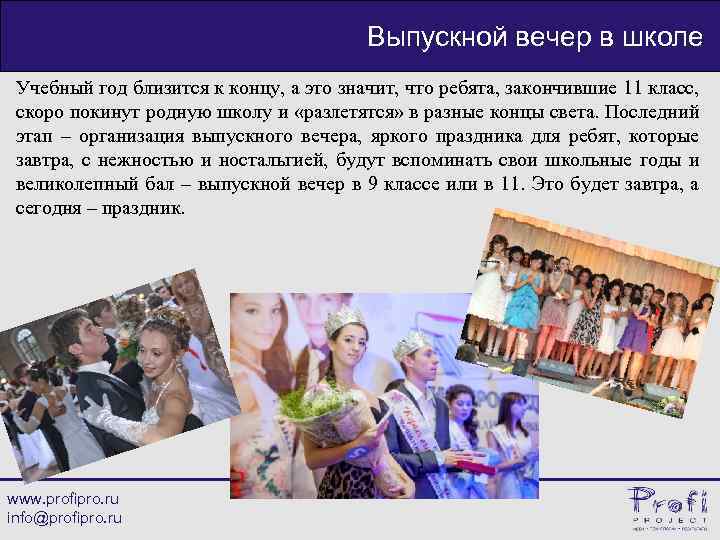 Выпускной вечер в школе Учебный год близится к концу, а это значит, что ребята, закончившие 11 класс, скоро покинут родную школу и «разлетятся» в разные концы света. Последний этап – организация выпускного вечера, яркого праздника для ребят, которые завтра, с нежностью и ностальгией, будут вспоминать свои школьные годы и великолепный бал – выпускной вечер в 9 классе или в 11. Это будет завтра, а сегодня – праздник. www. profipro. ru info@profipro. ru