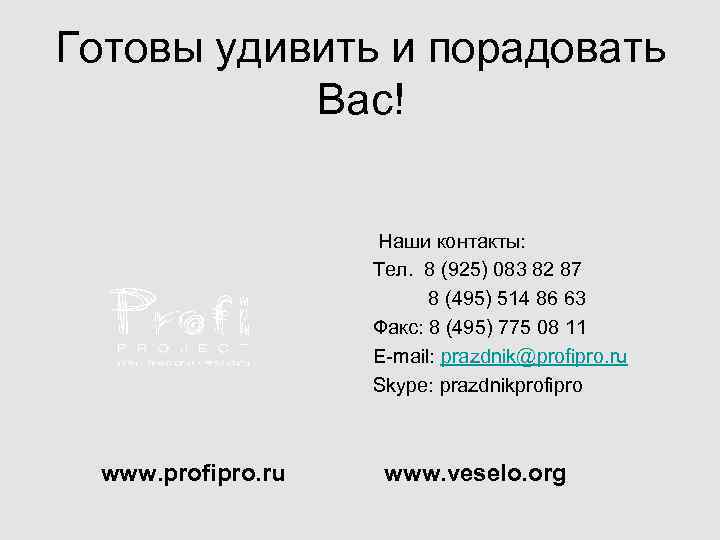 Готовы удивить и порадовать Вас! Наши контакты: Тел. 8 (925) 083 82 87 8 (495) 514 86 63 Факс: 8 (495) 775 08 11 E-mail: prazdnik@profipro. ru Skype: prazdnikprofipro www. profipro. ru www. veselo. org