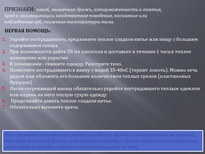 ПРИЗНАКИ: озноб, мышечная дрожь, заторможенность и апатия, бред и галлюцинации, неадекватное поведение, посинение или побледнение губ, снижение температуры тела. ПЕРВАЯ ПОМОЩЬ: Укройте пострадавшего, предложите теплое сладкое питье или пищу с большим содержанием сахара. При возможности дайте 50 мл алкоголя и доставьте в течение 1 часа в теплое помещение или укрытие. В помещении - снимите одежду. Разотрите тело. Поместите пострадавшего в ванну с водой 35-40oС (терпит локоть). Можно лечь рядом или обложить его большим количеством теплых грелок (пластиковых бутылок). После согревающей ванны обязательно укройте пострадавшего теплым одеялом или надень на него теплую сухую одежду. Продолжайте давать теплое сладкое питье. Обязательно вызовите врача. При признаках собственного переохлаждения - думай о самоспасении и не засыпай, двигайся; используй бумагу, пластиковые пакеты и другие средства для утепления своей обуви и одежды; ищи или строй убежище от холода.