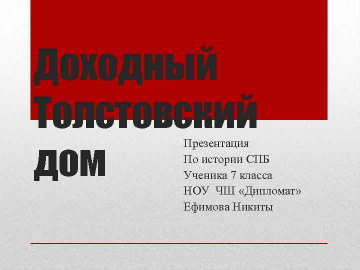 Доходный Толстовский дом Презентация По истории СПБ Ученика 7 класса НОУ ЧШ «Дипломат» Ефимова Никиты