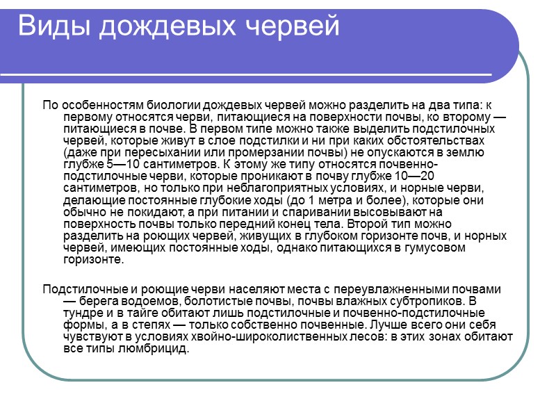 Виды дождевых червей По особенностям биологии дождевых червей можно разделить на два типа: к первому относятся черви, питающиеся на поверхности почвы, ко второму — питающиеся в почве. В первом типе можно также выделить подстилочных червей, которые живут в слое подстилки и ни при каких обстоятельствах (даже при пересыхании или промерзании почвы) не опускаются в землю глубже 5—10 сантиметров. К этому же типу относятся почвенно-подстилочные черви, которые проникают в почву глубже 10—20 сантиметров, но только при неблагоприятных условиях, и норные черви, делающие постоянные глубокие ходы (до 1 метра и более), которые они обычно не покидают, а при питании и спаривании высовывают на поверхность почвы только передний конец тела. Второй тип можно разделить на роющих червей, живущих в глубоком горизонте почв, и норных червей, имеющих постоянные ходы, однако питающихся в гумусовом горизонте. Подстилочные и роющие черви населяют места с переувлажненными почвами — берега водоемов, болотистые почвы, почвы влажных субтропиков. В тундре и в тайге обитают лишь подстилочные и почвенно-подстилочные формы, а в степях — только собственно почвенные. Лучше всего они себя чувствуют в условиях хвойно-широколиственных лесов: в этих зонах обитают все типы люмбрицид.